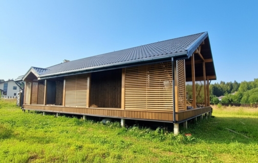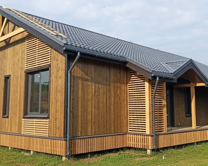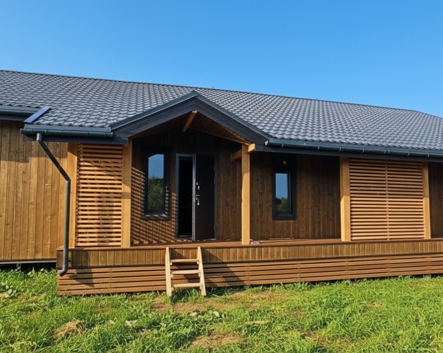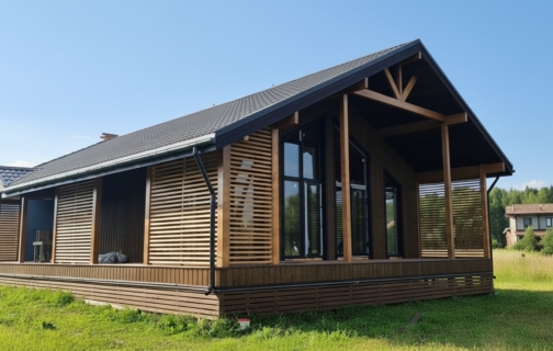 Шаг №4 – внешняя отделка дома: монтаж теплоизоляции (плиты из древесного полотна), фасадных панелей, сайдинга или имитатора бруса. Устанавливаем двери и окна, террасы, балконы и ограждения.