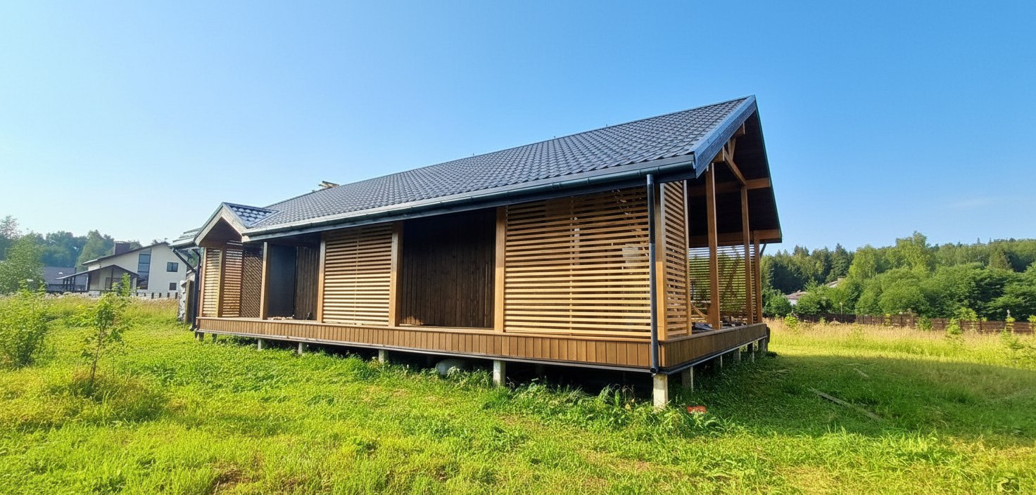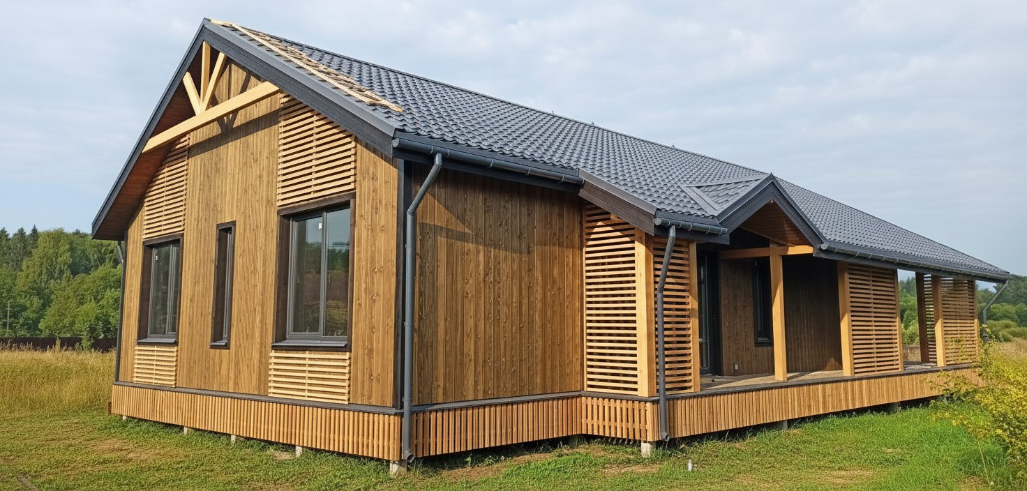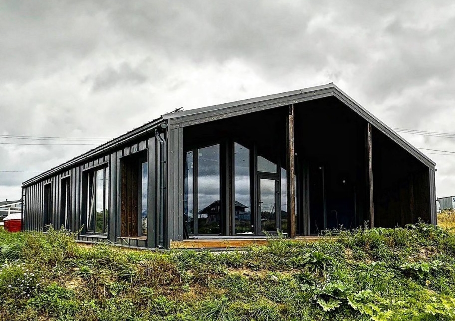 Шаг №4 – внешняя отделка дома: монтаж теплоизоляции (плиты из древесного полотна), фасадных панелей, сайдинга или имитатора бруса. Устанавливаем двери и окна, террасы, балконы и ограждения.