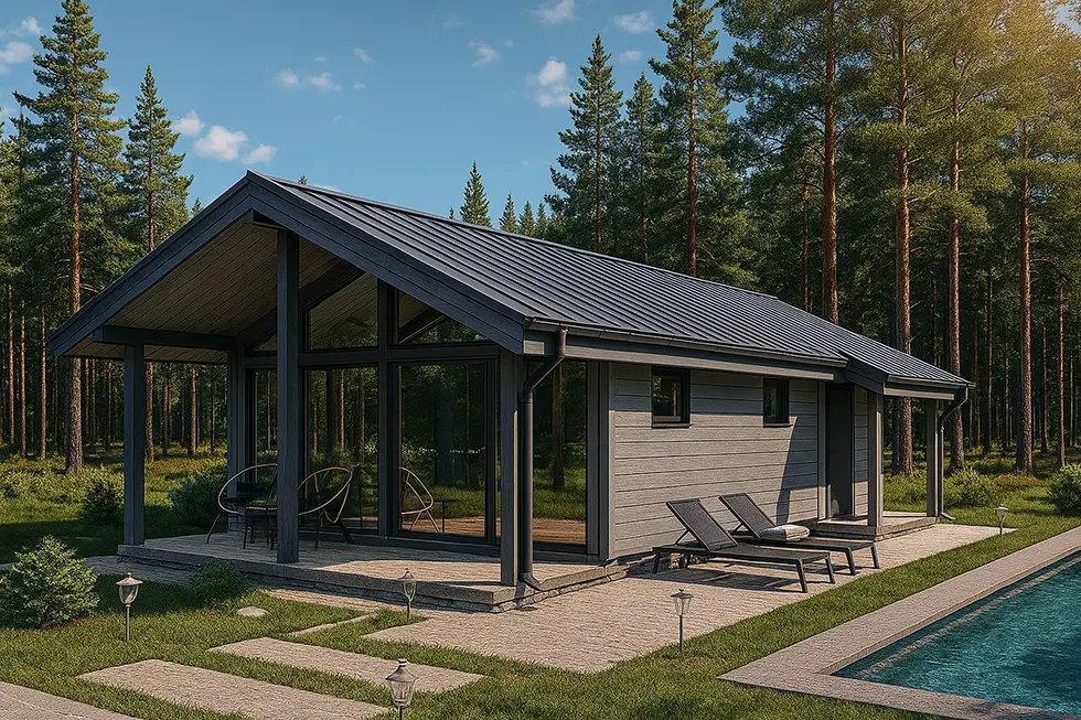 Каркасная баня с комнатой отдыха и кухней, 79,8 м²