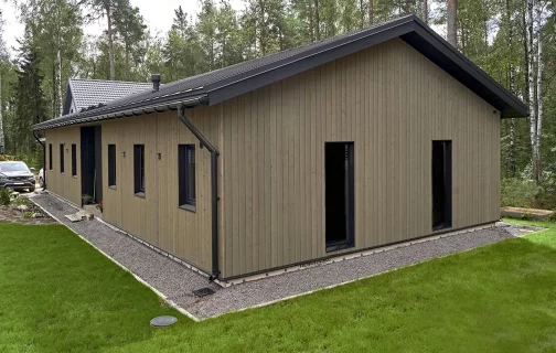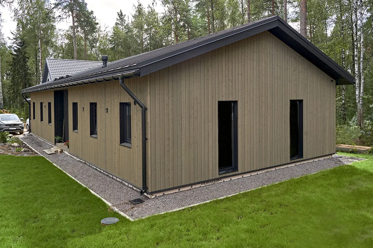 В январе 2025 года в коттеджном поселке Репино парк завершили строительство одноэтажного дома по проекту КД-1210. Это один из самых востребованных вариантов в скандинавском стиле. Чертеж был бесплатно скорректирован под пожелания заказчика — увеличили общую площадь здания.
