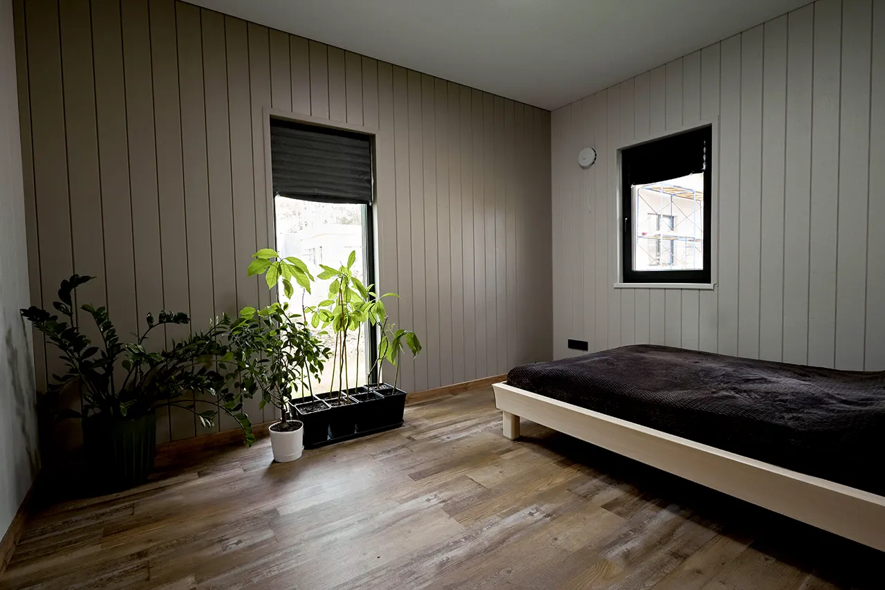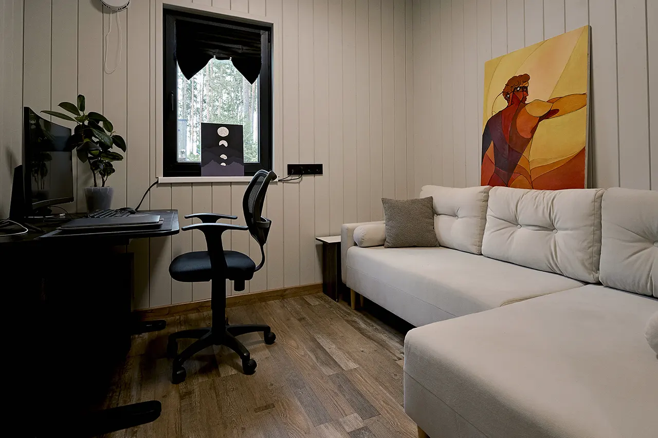 Планировка продумана с учетом повседневных потребностей семьи. В коттедже есть спальня для родителей, светлая детская, комнаты для гостей. Для удалённой работы предусмотрен кабинет. Гардеробная, постирочная и техническое помещение делают быт удобным и организованным, а современный санузел обеспечивает необходимый уровень комфорта.