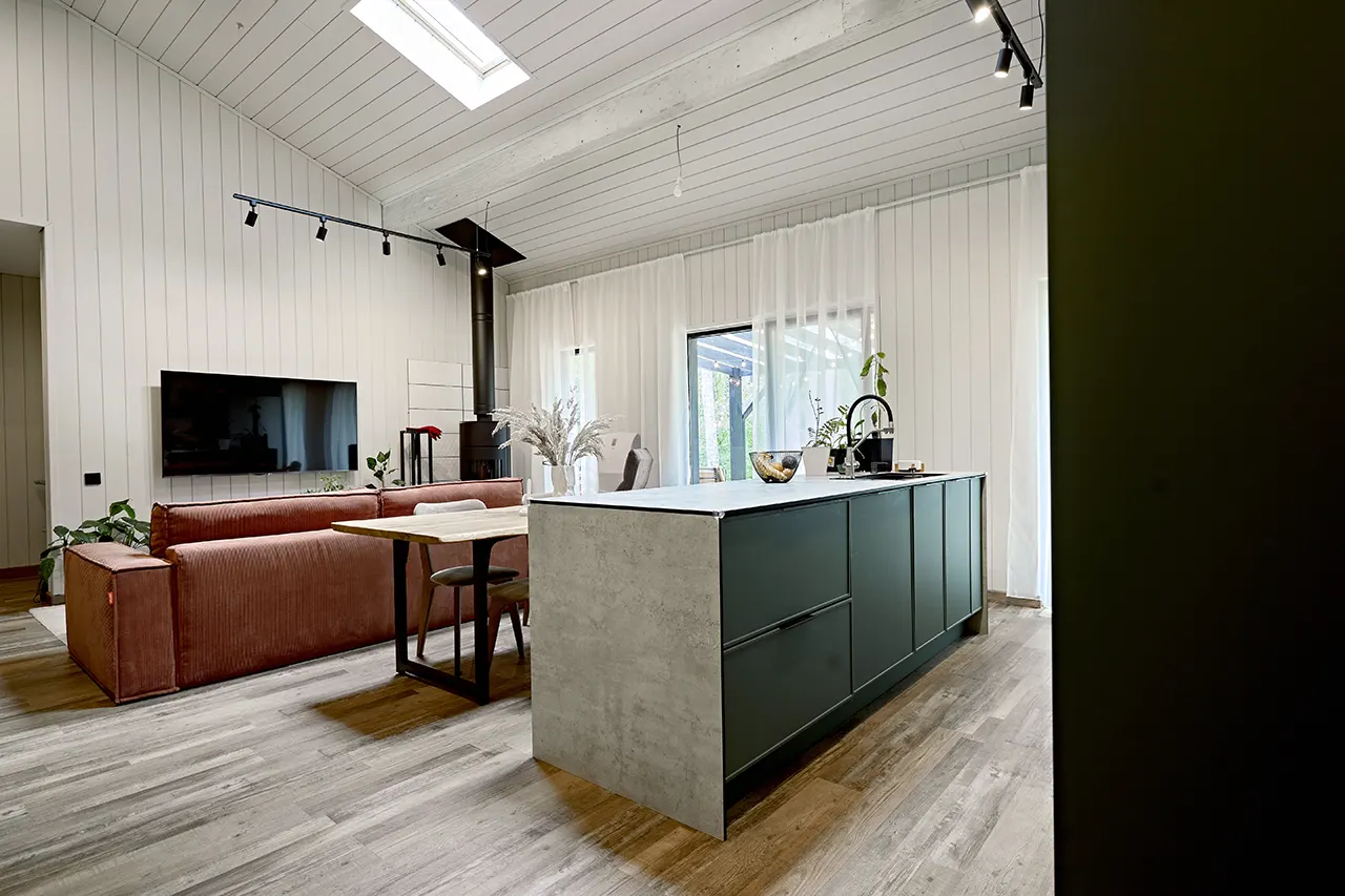 Местом дружных семейных встреч в новом доме стала большая кухня-гостиная площадью 49 м². Она переходит в огромную террасу 39 м². В теплое время года здесь открывается простор для трапез, встречи гостей, веселых игр с детьми.