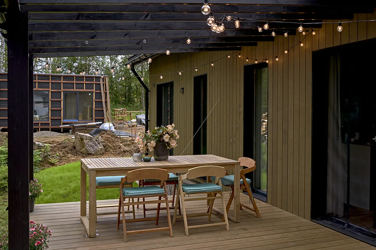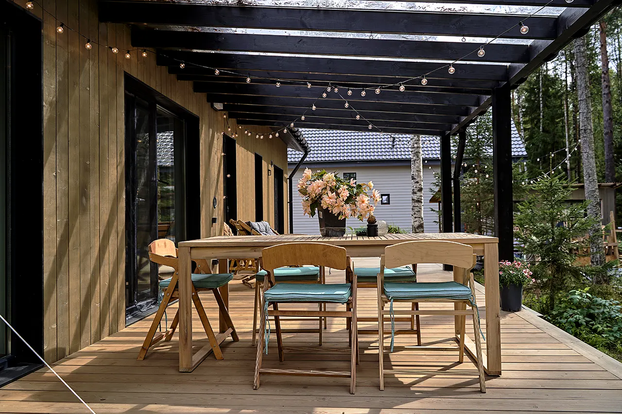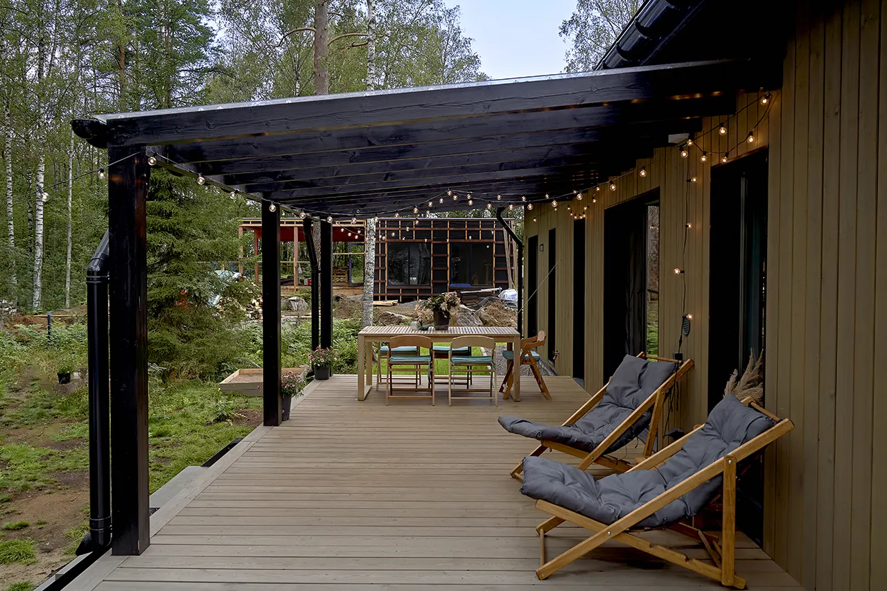 Каркасный дом стоит на прочной монолитной плите, а терраса опирается на свайно-винтовой фундамент. Двускатная кровля выполнена из кликфальца. Материал долговечен, отлично защищает от осадков. Визуально крыша создает аккуратный минималистичный силуэт.