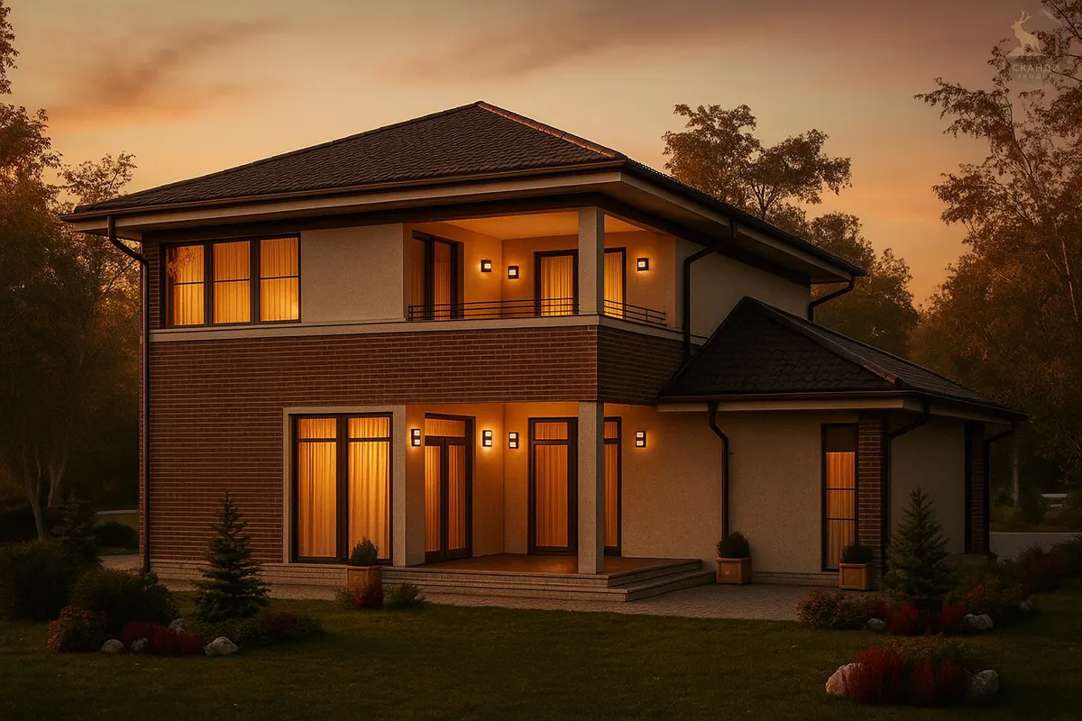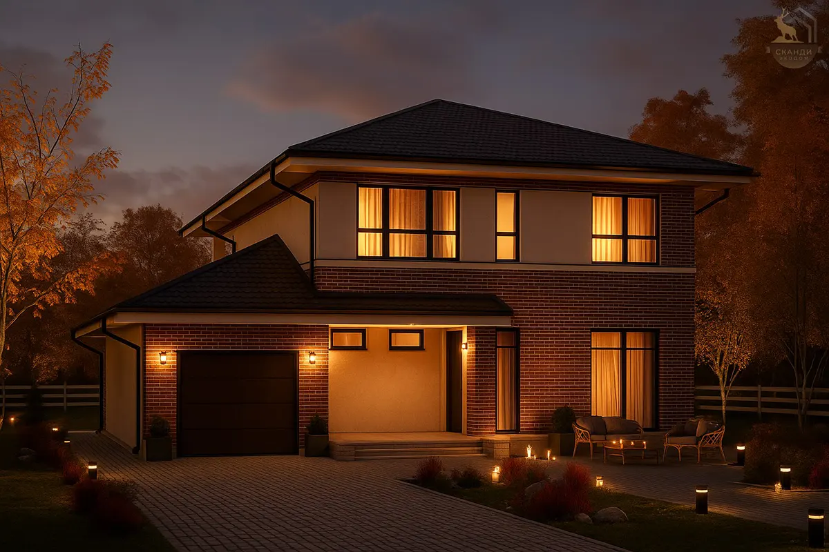Двухэтажный каркасный дом с балконом и гаражом, 185 м²