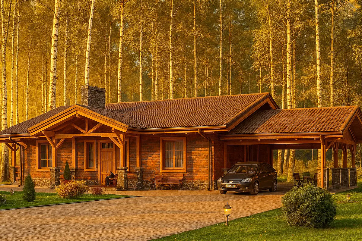 Одноэтажный каркасный дом с парковочным местом КД-390 – это просторное жилье для круглогодичного проживания за городом. Оно подойдет для тех, кто ценит личное пространство, просторные планировки, комфорт и надежность. Дом рассчитан на семью из 3-5 человек. При этом у каждого будет достаточно места, чтобы свободно разместить вещи и провести время наедине с собой. Удобно также, что семейный автомобиль всегда будет защищен от воздействия непогоды.