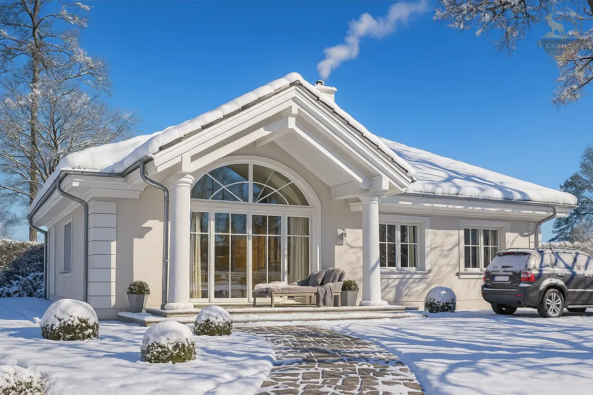 Каркасный дом с террасой и панорамным остеклением КД-420 – это усадьба в один этаж от компании «Сканди Эко Дом», исполненная в классическом английском стиле. На просторной площади в 132,7 м² свободно разместится и сможет круглогодично проживать семья из 3-5 человек. Это отличный вариант для тех, у кого есть маленькие дети. Отсутствие лестниц облегчит и обезопасит их перемещение.