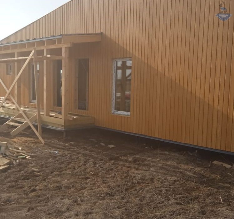 Снаружи дом отделан имитатором бруса «Карельский профиль». Материал является экологически чистым, стильно и лаконично смотрится, долгие годы сохраняет свои свойства.