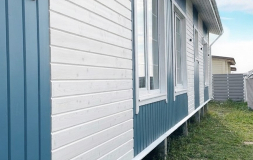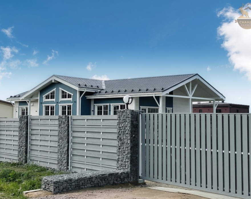 Внешняя отделка дома выполнена из доступного и практичного материала — имитации бруса «Карельский профиль». Заказчик предпочел покрасить доски в благородный и спокойный цвет морской волны.