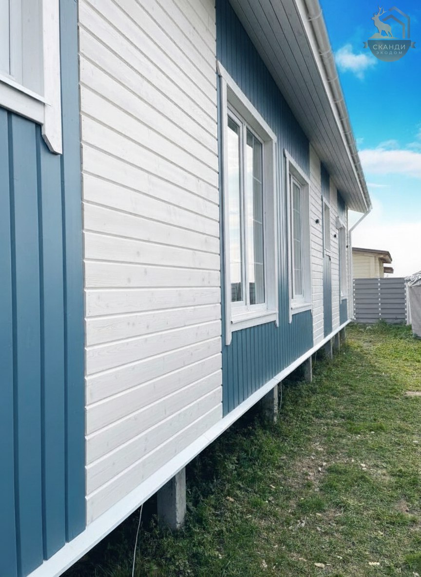 Внешняя отделка дома выполнена из доступного и практичного материала — имитации бруса «Карельский профиль». Заказчик предпочел покрасить доски в благородный и спокойный цвет морской волны.